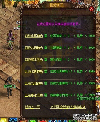 1.76网页传奇北冥神功技能等级1-3级,可通过释放技能次数来提升等级,而该技能4级、5级升级的方法,可以使用对应等级的北冥神功技能书来提升。这些技能书也可在“勤劳矿工”兑换,四级北冥神功需要北冥神功2本和5000礼券,而五级北冥神功需要四级北冥神功2本和9999礼券。